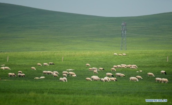 Sheep forage on the Xilingol Grassland in North China's Inner Mongolia autonomous region, July 12, 2021. [Photo/Xinhua]