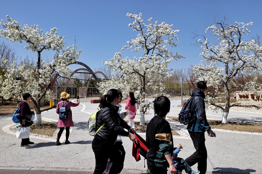Tourists enjoy blossoms in Bejing Expo Park on April 16, 2022. [Photo by Jiang Dong / chinadaily.com.cn]