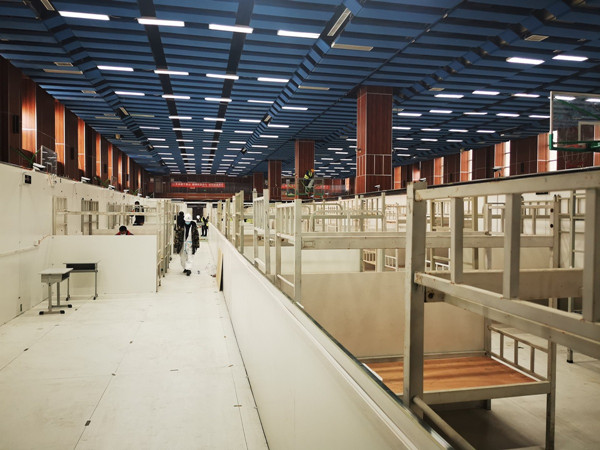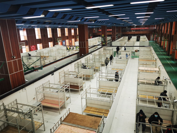 Workers turn an indoor arena into a hospital in Jilin city, Northeast China's Jilin province. [Photo by Wang Naizhuo/For chinadaily.com.cn]