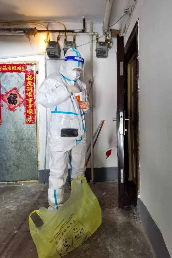Li Qishi takes COVID-19 rapid antigen test kits to residents of the Yan'an community in Changchun, Jilin province. [Photo provided to chinadaily.com.cn]