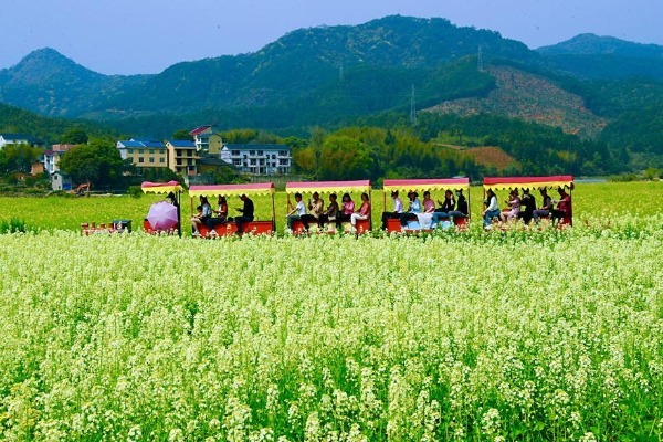As spring arrives and temperatures rise, colorful rape flowers have entered full bloom in Wufu town in Wuyishan, Fujian province, attracting many tourists for sightseeing. The town has planted not only rape but also lotus, gesang and chimonanthus, making it a place where flowers can be viewed through all four seasons.