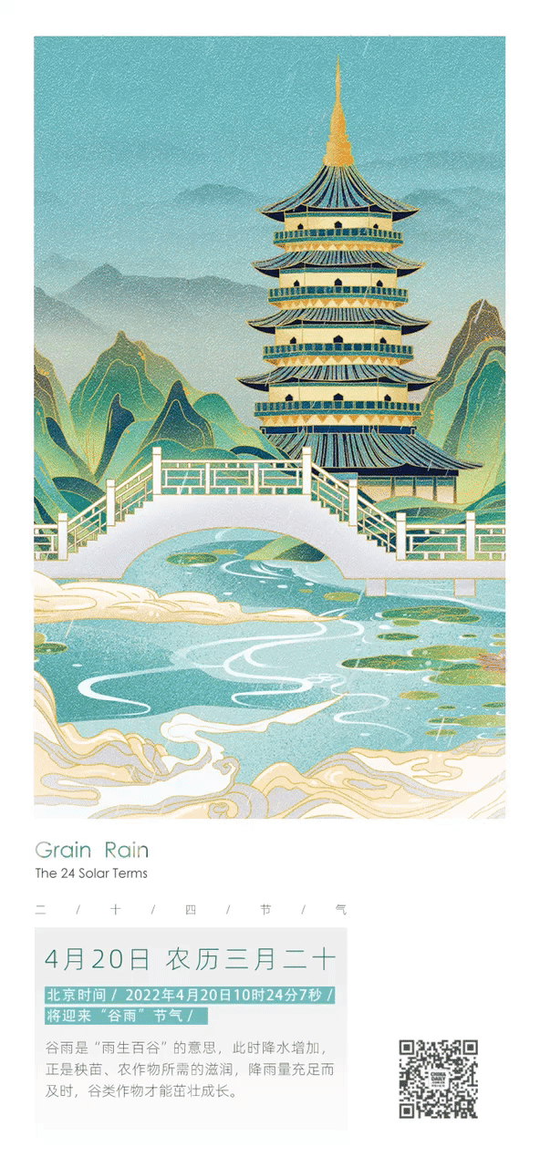 The traditional Chinese lunar calendar divides the year into 24 solar terms. Grain Rain (Chinese: 谷雨), as the last term in spring, starts on April 20 and ends on May 4.