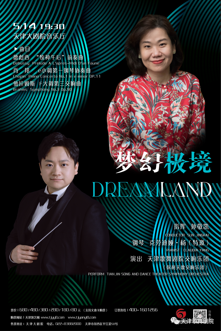 The Symphony Orchestra of Tianjin Song & Dance Theater and pianist Claudia Yang will perform at a concert at the Tianjin Grand Theater on May 14. Titled Dreamland, the concert will present the great works of Achille-Claude Debussy, Fryderyk Franciszek Chopin and Johannes Brahms. Stay tuned!