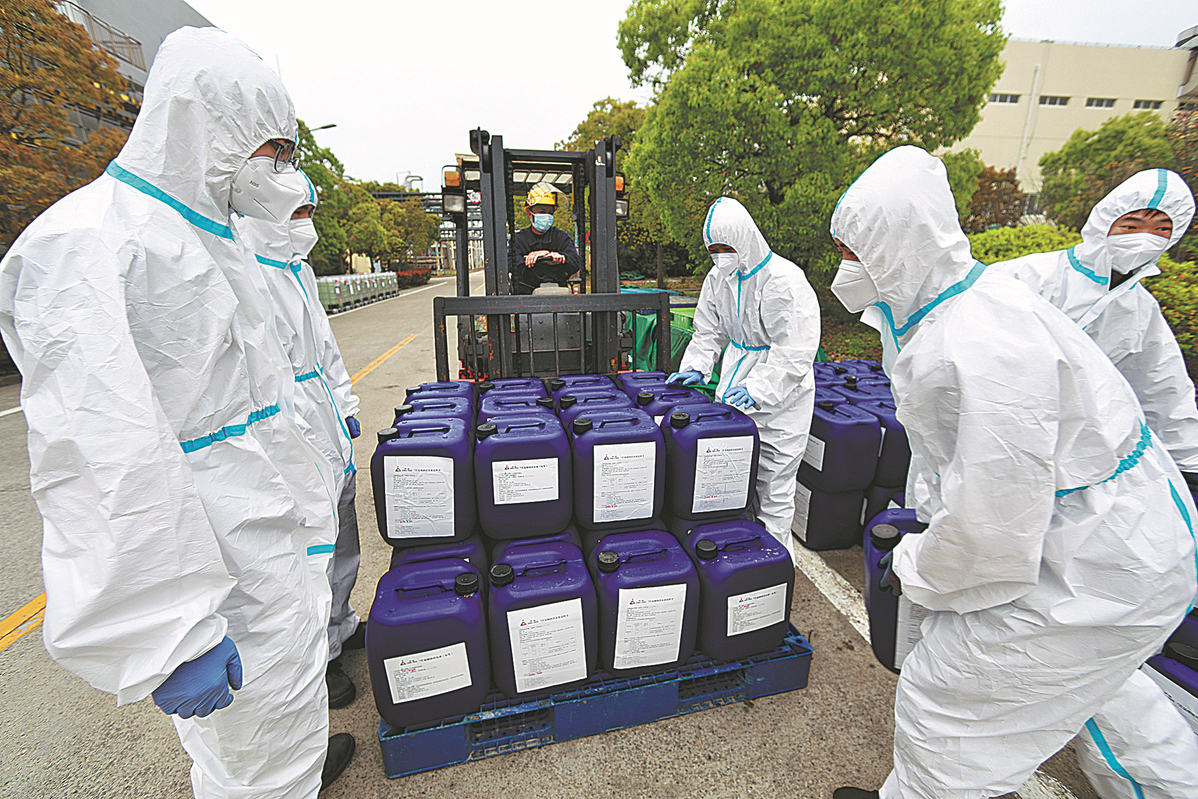 Employees from Shanghai Chlor-Alkali Chemical Co Ltd move sterilizing fluids in East China's Shanghai on April 22, 2022. Since the start of this week, 70 percent of the city's 666 key enterprises have resumed their operations. [Photo by Zhu Xingxin/China Daily]
