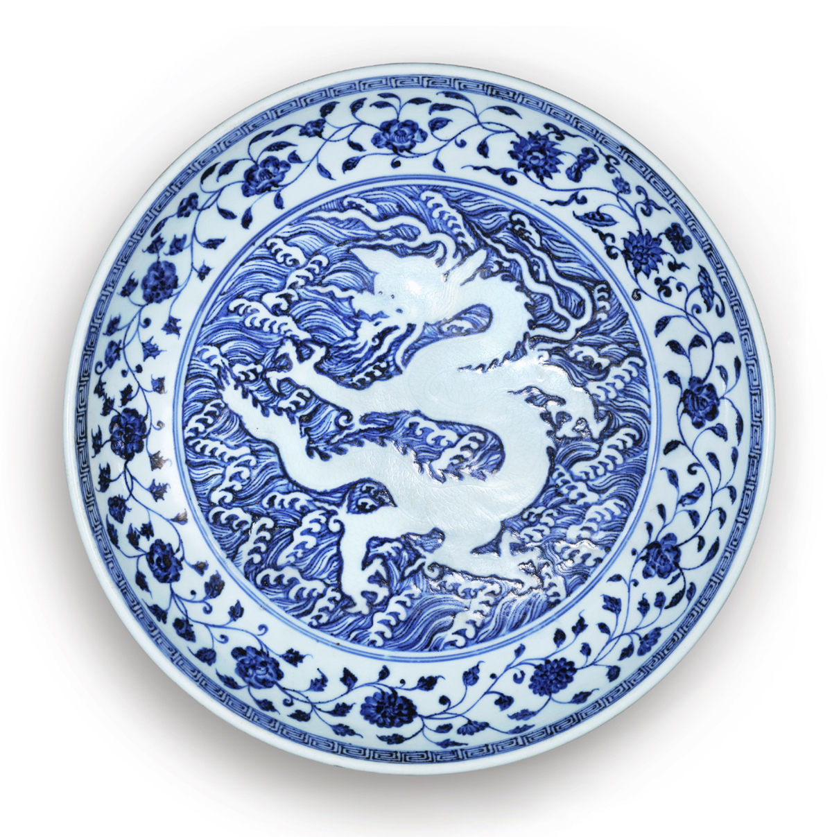 Blue-and-white porcelain plate with dragon in wave pattern, Yongle reign (1403-1424) of the Ming Dynasty, from the collection of famous Danish architect Salomon Sörensen (1856-1937) [Photo/Official WeChat account of the Poly Art Museum]