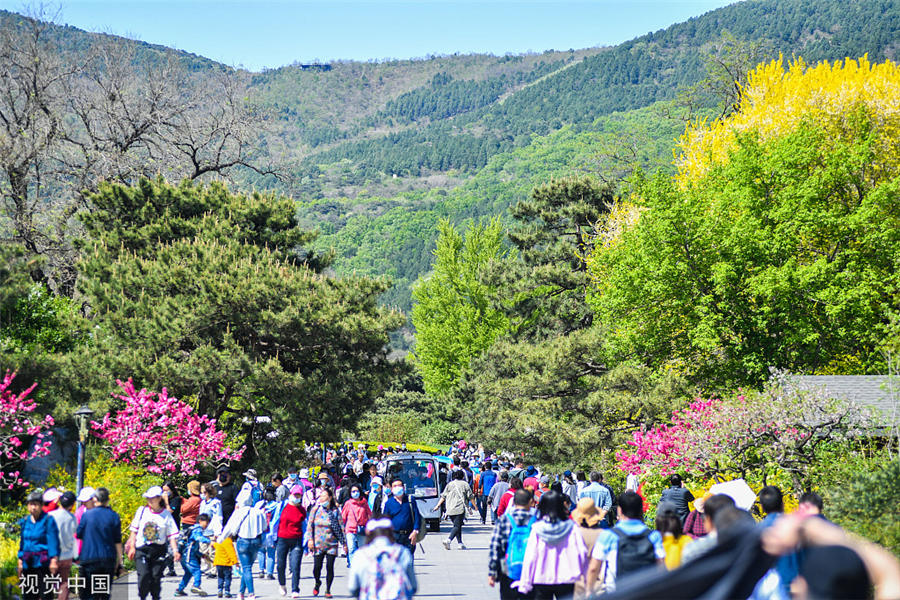 People view blooming flowers at the China National Botanical Garden in Beijing on April 22, 2022. [Photo/VCG]