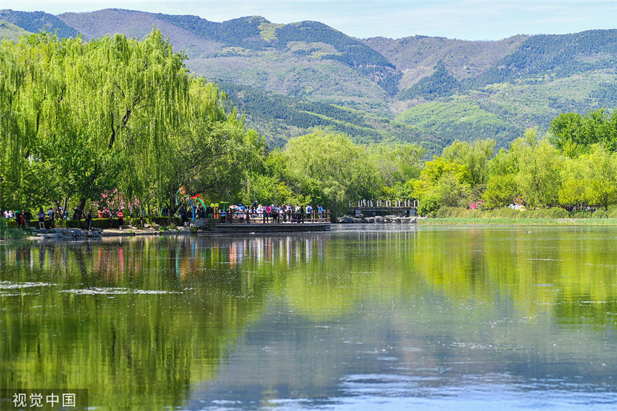 People view blooming flowers at the China National Botanical Garden in Beijing on April 22, 2022. [Photo/VCG]