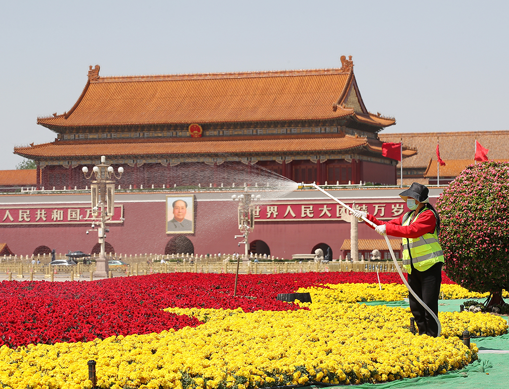 A worker waters flower beds in the Tian’anmen Square in Beijing. [Photo/IC]