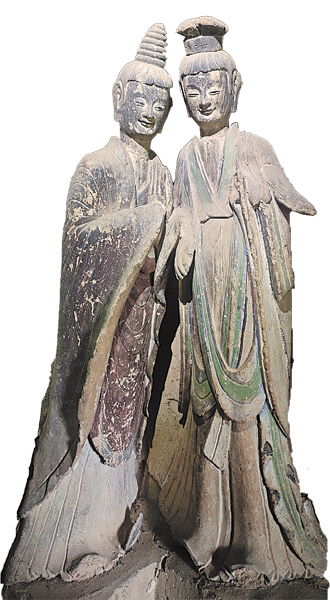 A sculpture from the Northern Wei Dynasty (386-534) in Cave 121 of the Maijishan Grottoes showing a smiling bodhisattva and a monk. [Photo provided to China Daily]