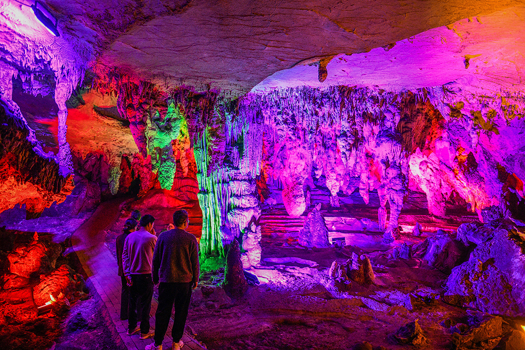 What beautiful karst caves! In Shiyakou village, Anlong county, Southwest China’s Guizhou province, a river runs through them. The caves are illuminated by colorful light bulbs covered by mud and powered by village electricity. Reflected in the water, the lighted caves look oh so dreamy.
