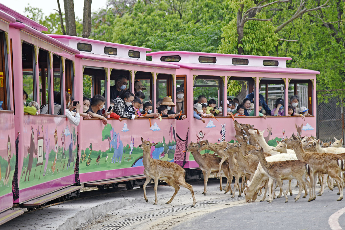 Tourists take a sightseeing train to see the animals in a wildlife park in Changzhou, East China's Jiangsu province, on April 28, 2022. [Photo by Xia Chenxi/For chinadaily.com.cn]