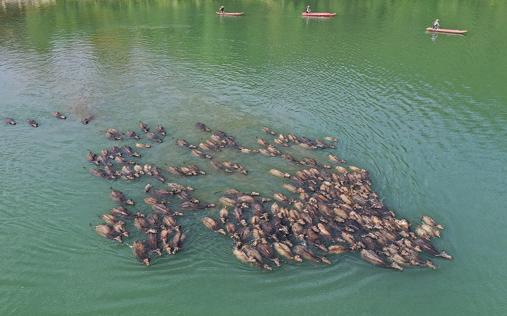The magnificent view of over 100 buffaloes crossing the Jialing River in Pengan county, Nanchong, Southwest China’s Sichuan province. [Photo by Liu Yonghong/provided to chinaservicesinfo.com]