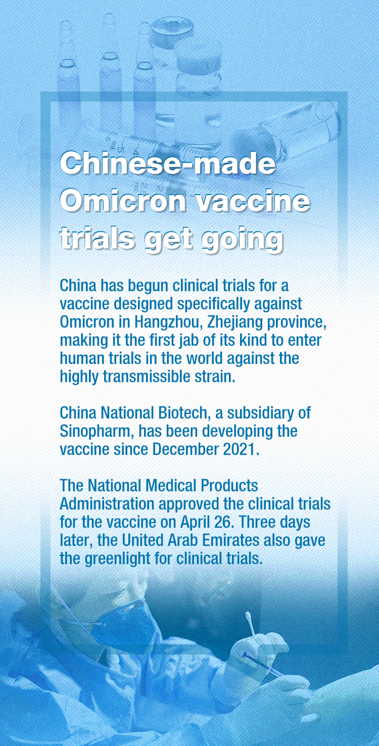 China began clinical trials for a vaccine designed specifically against the Omicron variant in Hangzhou, Zhejiang province, on Sunday, making it the first vaccine of its kind to enter human trials in the world against the highly transmissible COVID-19 strain.