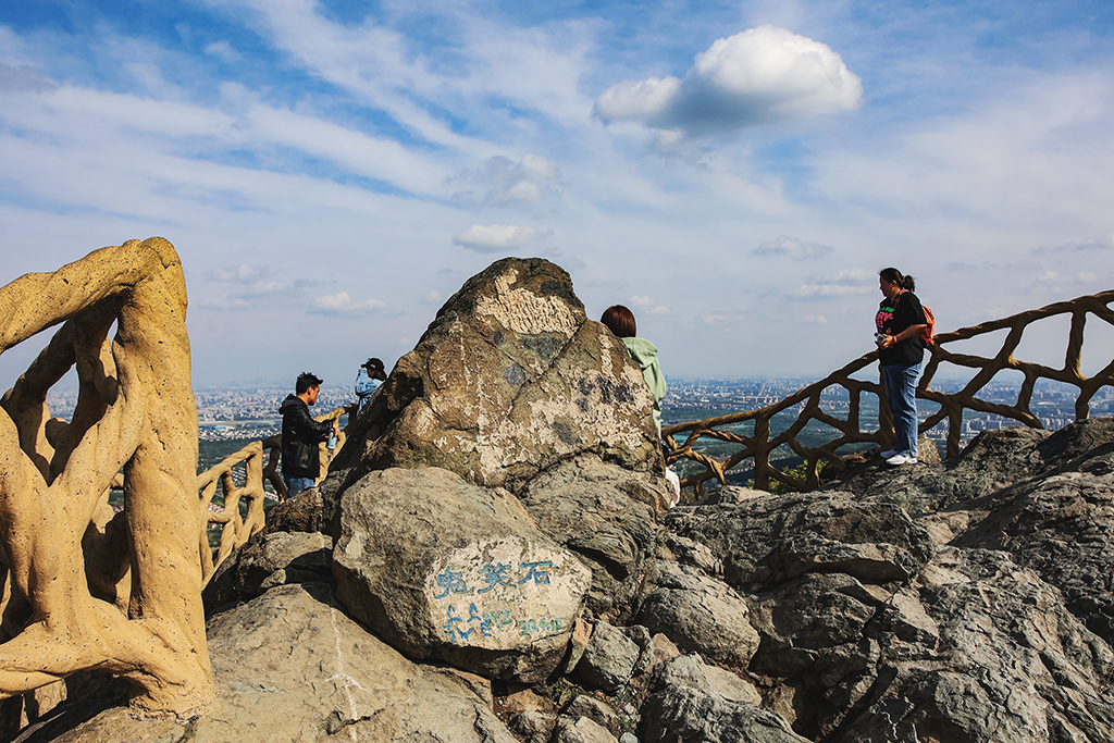 Tourists reach the ghost laughing stone to see the panorama of Beijing from the mountaintop of the Beijing Xishan National Forest Park. [Photo/IC]