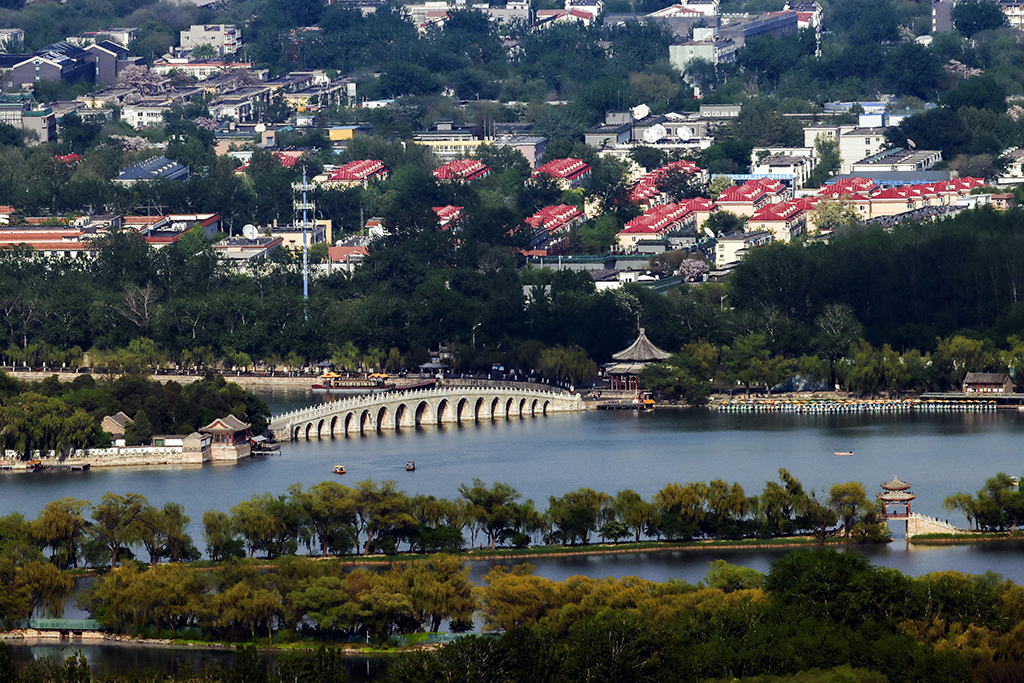 The Seventeen-Arch Bridge of the Summer Palace is seen from the mountaintop of the Beijing Xishan National Forest Park. [Photo/IC]