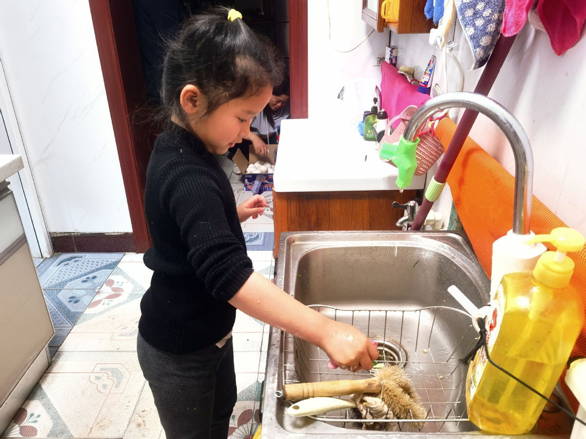 A girl does housework in her home in Laishui county, Hebei province, May 4, 2022. [Photo/IC]