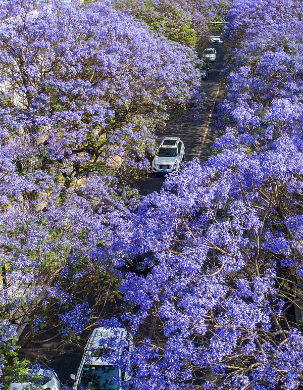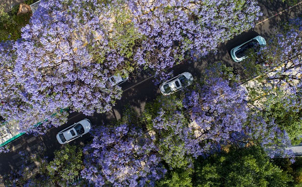 An aerial photo taken on April 30 in Kunming, Southwest China's Yunnan province, shows bluebonnets in full bloom. [Photo/Xinhua]