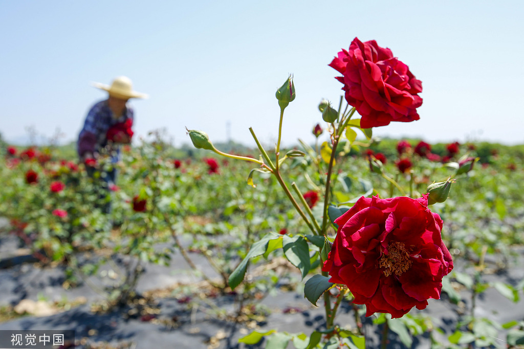 A farmer picks roses at a planting base in Kunsha village, Huizhou district, Huangshan city, East China's Anhui province on May 5, 2022. Rose petals can be made into essential oil, jam, vinegar, tea, liquor and rose flower cakes. The district has promoted the rose planting industry in recent years, increasing income for local farmers and boosting rural vitalization. [Photo/VCG]