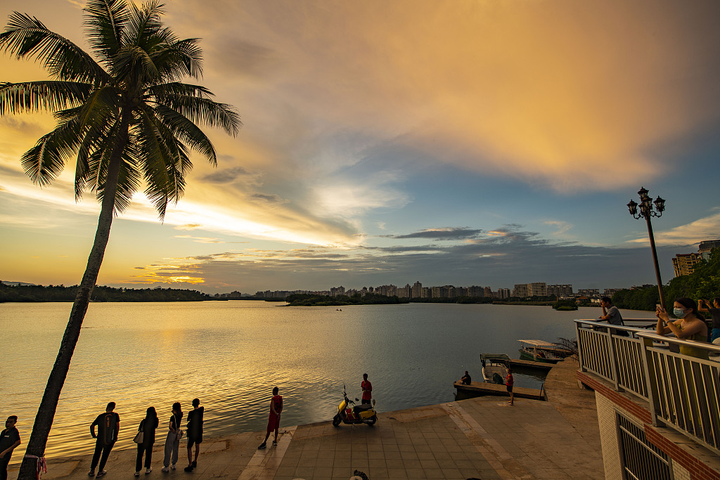 People take a walk by the Wanquan River in Qionghai, South China’s Hainan province and enjoy the sunset scenery. [Photo/VCG]