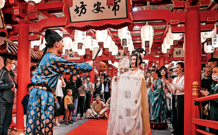 To create an immersive experience, staff members dressed in hanfu would join the crowd and interact with the tourists by, for example, handing them flower seeds, the staff member said, adding that services such as hanfu rental and traditional makeup design are available in the park.