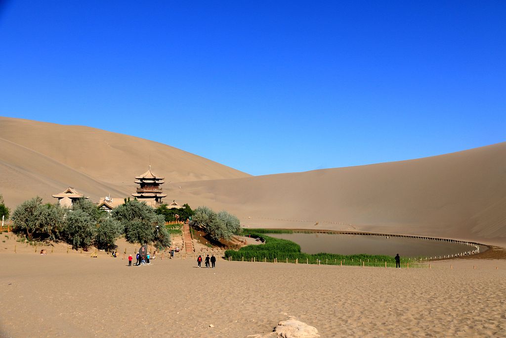 Dubbed “one of the top five beautiful deserts in China” the Mingsha Mountain and Crescent Moon Spring scenic area in Dunhuang, Northwest China’s Gansu province boasts picturesque views in early summer. The spring's name derives from the crescent moon shape of the small pool between two large sand dunes.