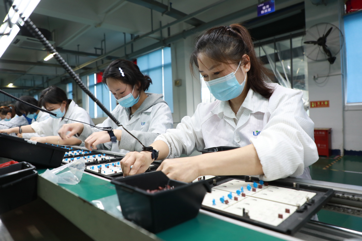 Workers make electronic products for export in Meishan, Southwest China's Sichuan province on May 18, 2022. [Photo/IC]