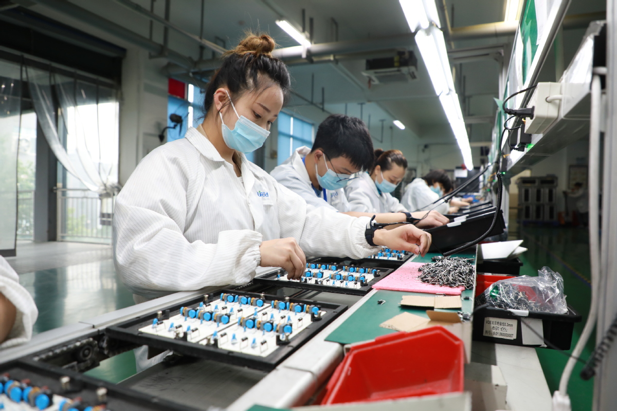 Workers make electronic products for export in Meishan, Southwest China's Sichuan province on May 18, 2022. [Photo/IC]