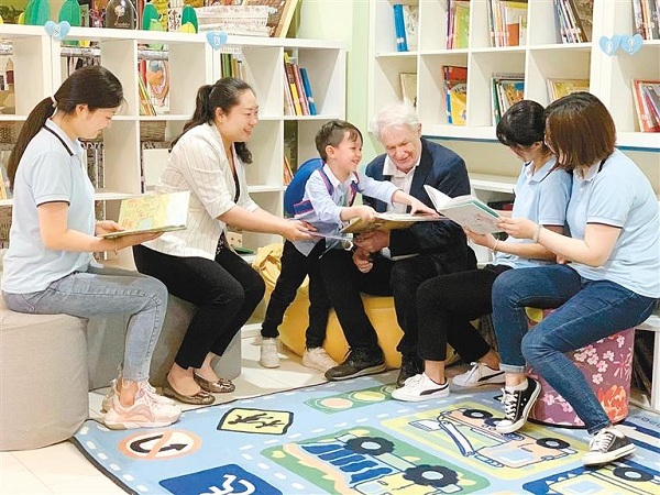 John Carmichael and his son take part in a fun reading session at a kindergarten in Xi'an. [Photo/Xi'an Daily]