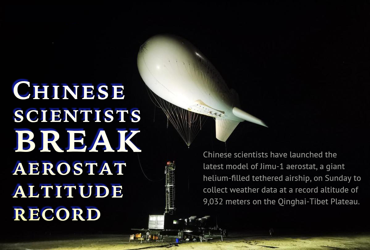 Chinese scientists have launched the latest model of Jimu-1 aerostat, a giant helium-filled tethered airship, on Sunday to collect weather data at a record altitude of 9,032 meters on the Qinghai-Tibet Plateau.