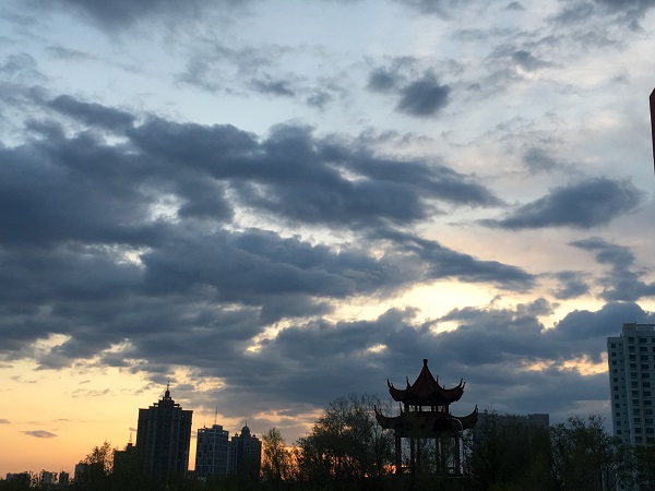 And what beautiful clouds accompany the sunset, it feels like they're following the sun. You can peer into the clouds for hours and look for new and new shapes. Looking at the clouds in this photo, I see a large dragon with outstretched wings. That is why this photo penetrates into all corners of the soul. The pagoda and the dragon flying behind it symbolize great China and make you proud of the opportunity to study and live here.