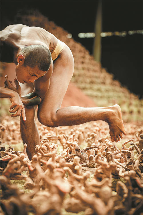 Yu was born and raised in the village. More than 500 villagers, including his family members, childhood friends and neighbors, watched the show. On an empty square, which is about 600 square meters, Yu danced through 10,693 figurines made of clay, ranging in heights from 25 to 36 centimeters. The figurines, in different poses, were arranged on the ground in circles. As Yu danced around them, he reached a cone-shaped stage made of clay, which, about 4.8 meters tall, stood in the center of the ground. On the top of the cone-shaped stage, Yu kept on dancing until his body was fully covered in mud. Then a fire was lit around the stage, which gradually dried the mud on Yu's body, turning him into the"10,694th figurine".