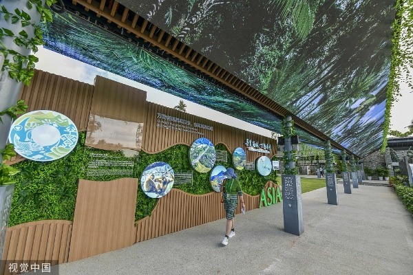 A woman passes by exhibition boards of the "Finding the rainforest a haven for all" rainforest cultural exhibition at the Boao Forum for Asia Theme Park in Qionghai of South China's Hainan province on April 20. [Photo/VCG]