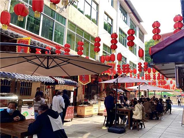 Tourists eat Shaxian snacks in a snacks street in Yubang village. [Photo provided to chinadaily.com.cn]