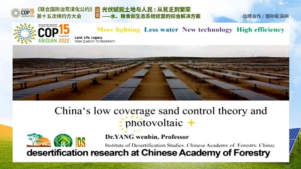 At the side event, Ningxia Baofeng Group's innovative project integrating solar energy and modern agriculture was shown to representatives from all over the world as an example of Chinese enterprises participating in desertification control.