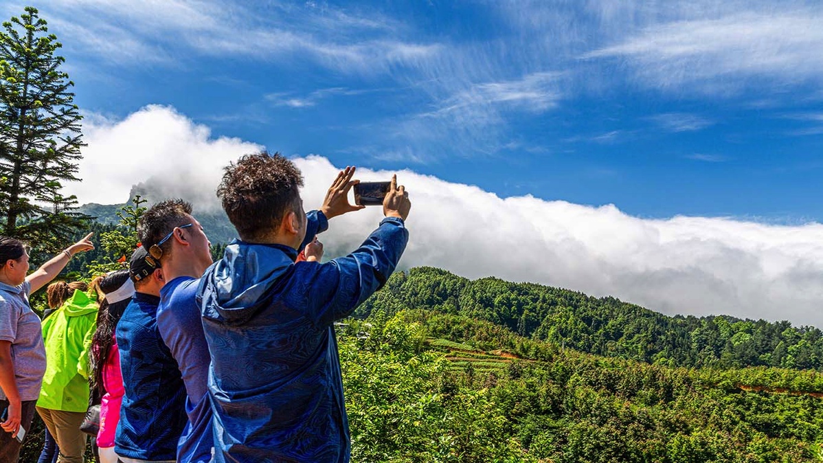 Feast your eyes on the magnificent scenery of Mount Jinfo in Chongqing! A beautiful and rare waterfall of clouds over the mountains draws tourists.
