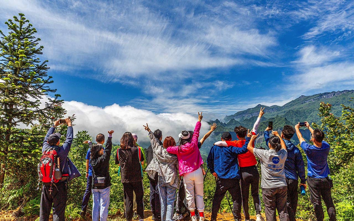 Tourists enjoy the breathtaking view of the waterfall of clouds appearing over Mount Jinfo in Chongqing. [Photo/IC]