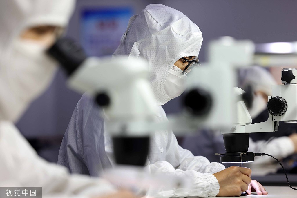Workers are seen at the workshop of Hefei IC Valley Microelectronics Co Ltd, May 26, 2022. [Photo/VCG]