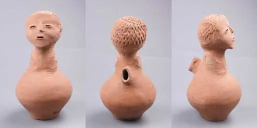 Front, back and side views of the human-shaped terracotta pot in the collection of the Xi’an Banpo Museum [Photo/Official WeChat account of the Xi’an Banpo Museum]