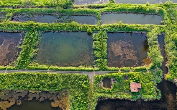 Photo shows an aerial view of fish ponds at Longhu Wetland Park in Jinan, East China's Shandong province, May 17, 2022. [Photo/IC]