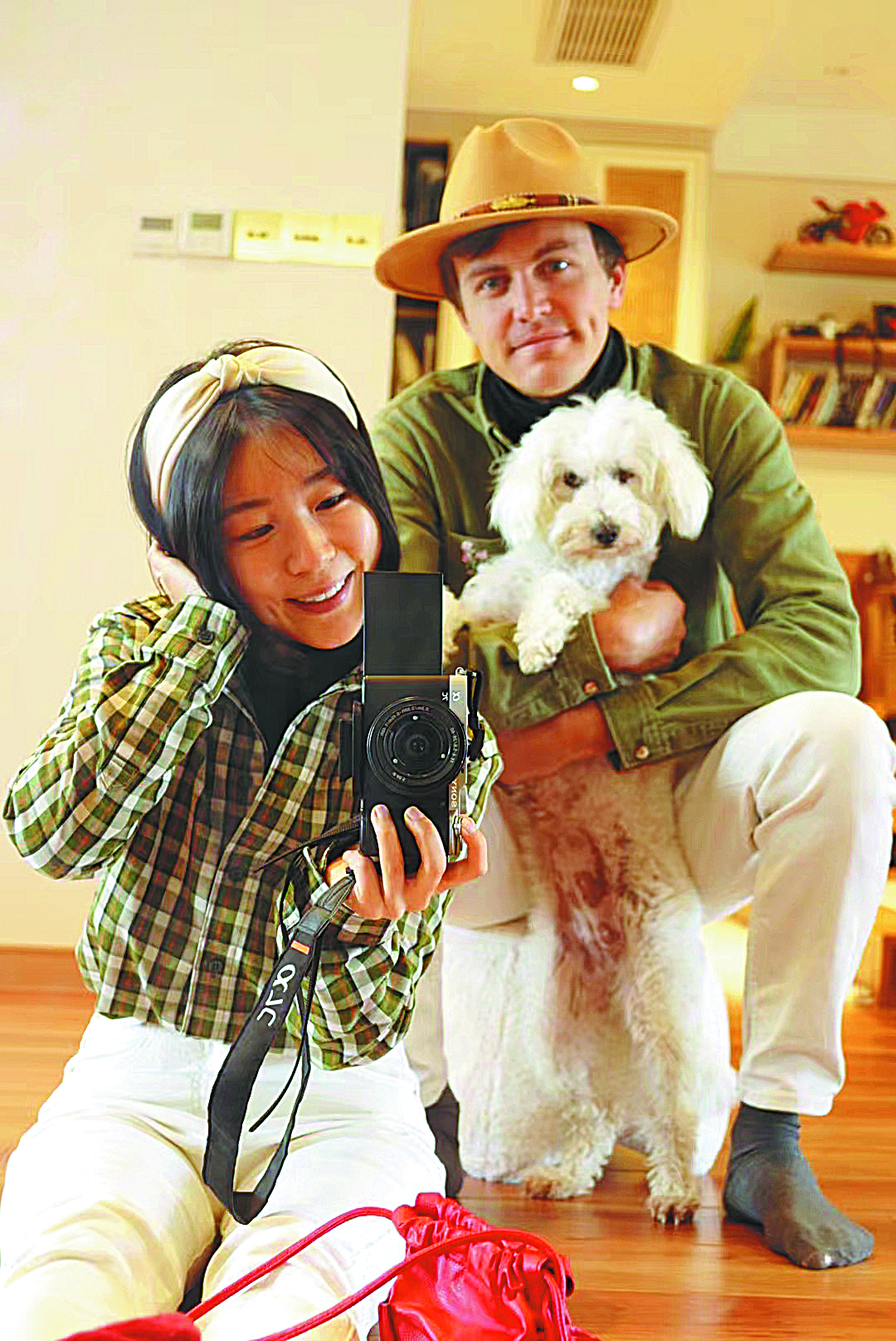 The couple take photos of their outfits at home in Huangshan, Anhui, in March. [Photo/CHINA DAILY]