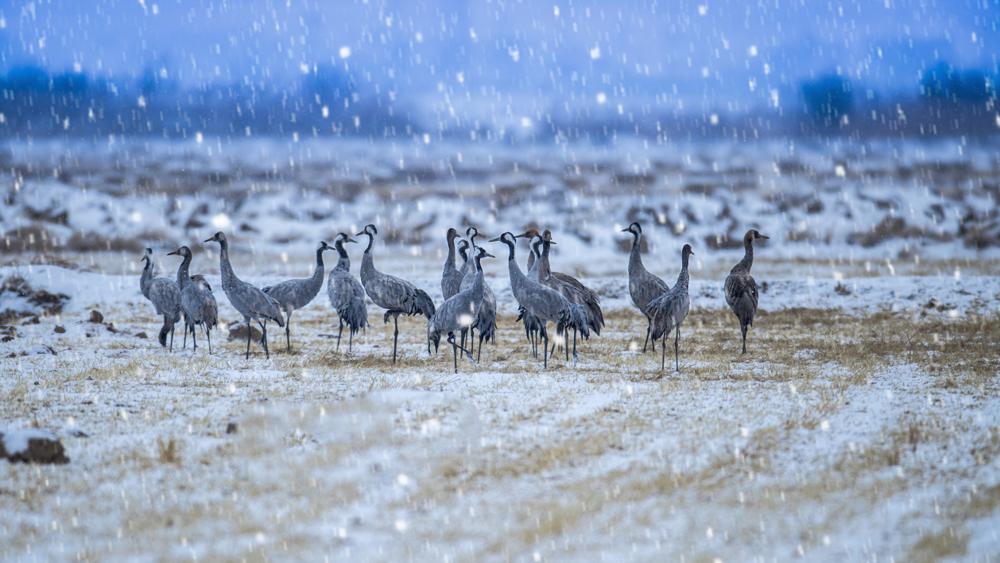 There is a line in an old Chinese poem referring to "a wild crane's footprints on mud or snow". The cranes stood, seemingly attracted by the snow in Shizuishan.
