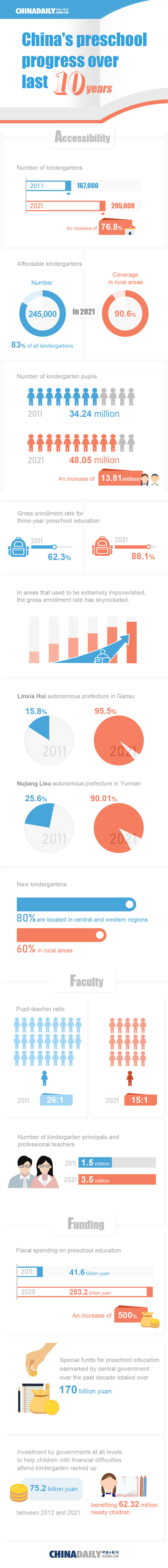 China has been firmly committed to improving its education system and preschool education, which concerns the growth and development of children, is a top priority. Here is an overview of the progress the nation has made in preschool education during the past 10 years.
