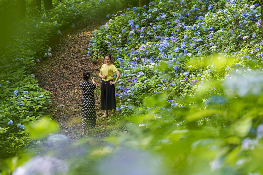 Blooming hydrangea flowers draw visitors to the Huaxi Valley in Nanchang, Jiangxi province. [Photo/VCG]