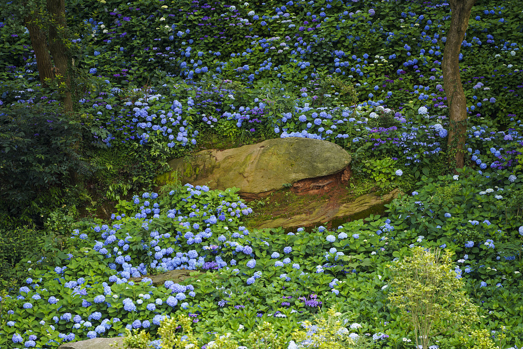 Blue hydrangea flowers bloom in the Huaxi Valley scenic area in Nanchang, Jiangxi province. [Photo/VCG]