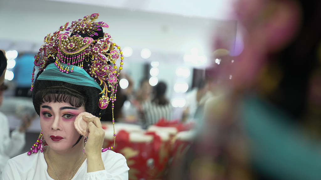 A Qiongju Opera actress puts on make-up. [Photo/VCG]