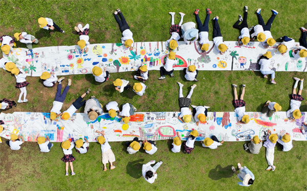 Children draw pictures on long scrolls to celebrate International Children's Day in Huzhou, Zhejiang province on May 31, 2022. [Photo by Wang Zheng/for chinadaily.com.cn]