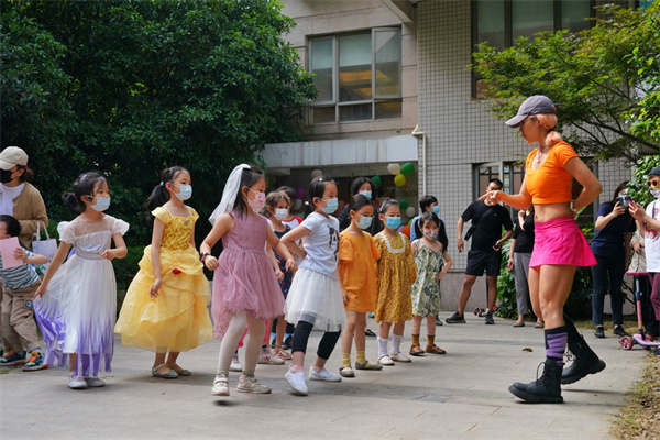 Children learn to dance at a residential community in Changning district of Shanghai on May 31, 2022. [Photo by Gao Erqiang/chinadaily.com.cn]