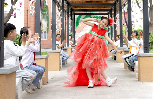 Children put on a runway show with clothes made from discarded garbage at a primary school in Hai'an city, Jiangsu province on May 31, 2022. [Photo by Xiang Zhonglin/for chinadaily.com.cn]