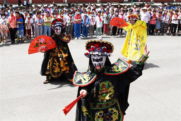 Students perform Sichuan Opera face-changing at a primary school in Zaozhuang city, Shandong province on May 31, 2022. [Photo by Li Zongxian/for chinadaily.com.cn]