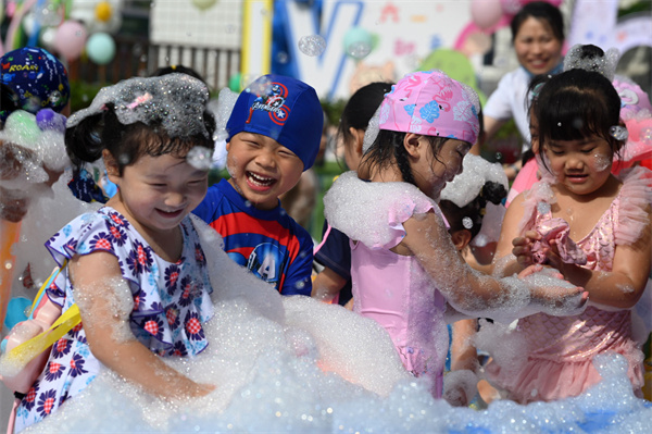 Children have fun with foam at a kindergarten in Dongxing district of Neijiang city, Sichuan province on May 31, 2022. [Photo by Lan Zitao/for chinadaily.com.cn]